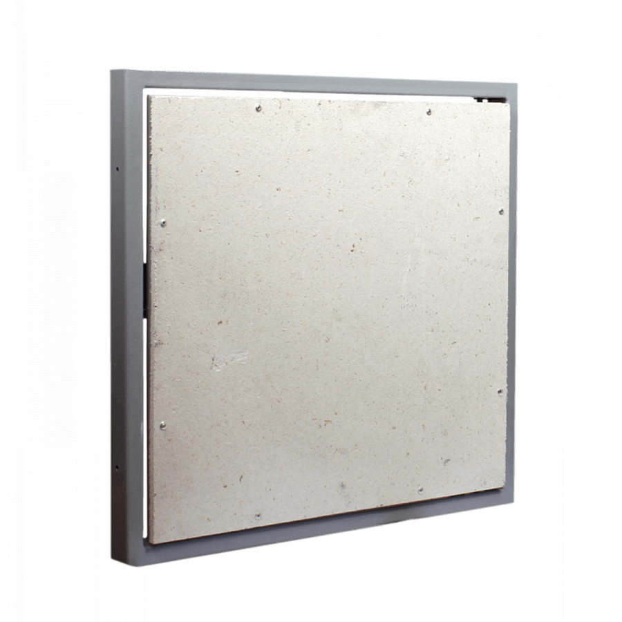 Материал изделия: рама и дверца - стальной профиль, дверца - плита ГВЛ (гипсоволоконный влагостойкий лист), петля - стальная однозвенная. Принцип открытия: нажимной, открывается нажатием на край плитки. Система регулировки межплиточных зазоров: по вертикали.