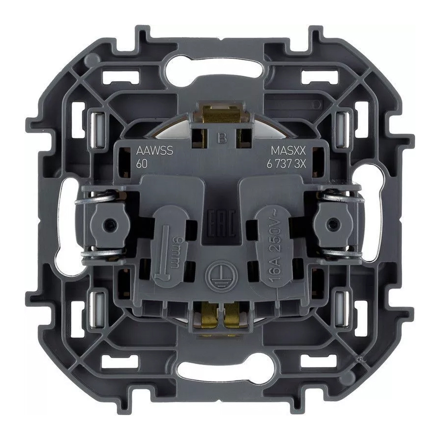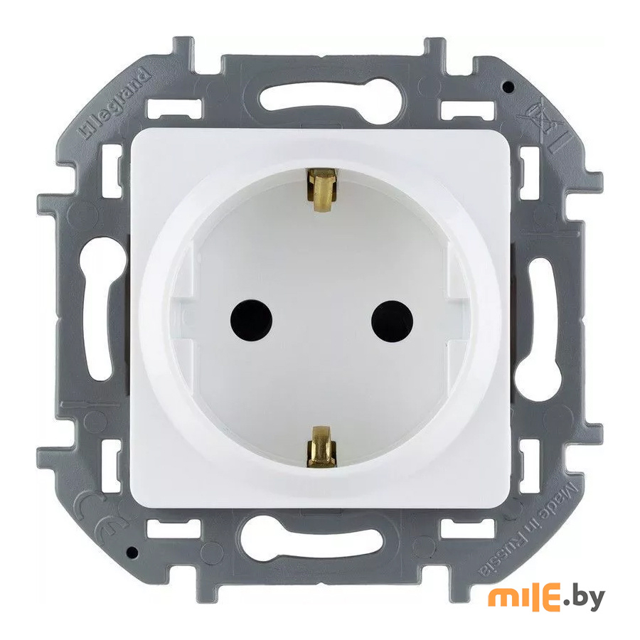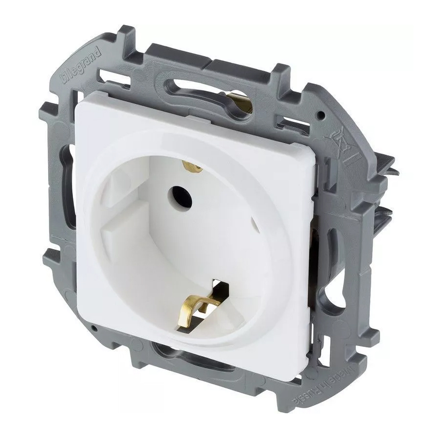Розетка с заземлением и интегрированными защитными шторками Legrand Inspiria для скрытого монтажа. Максимальный ток 16 А, напряжение ~250В, максимальная мощность 3680 Вт.