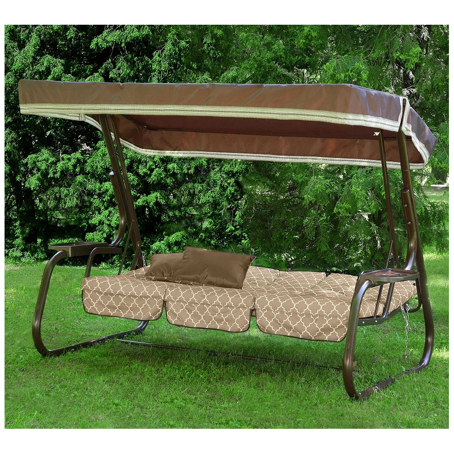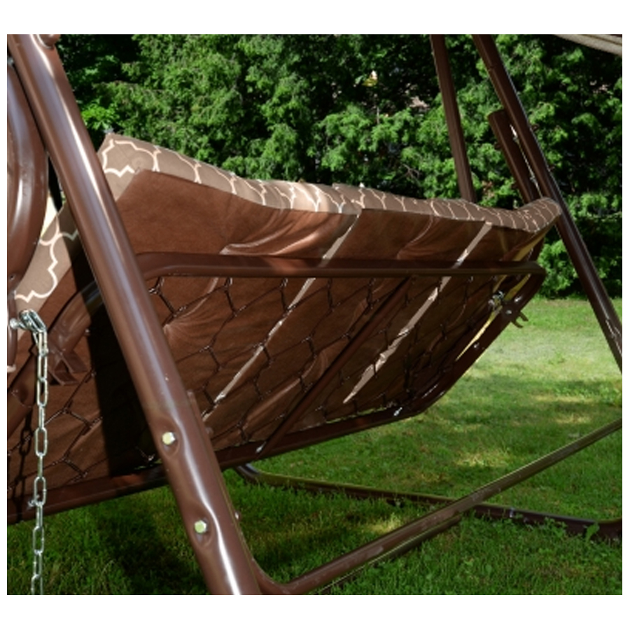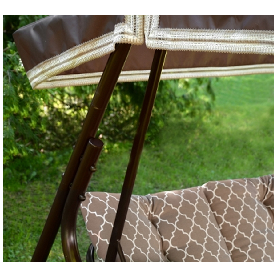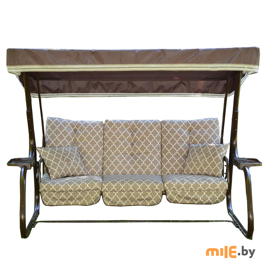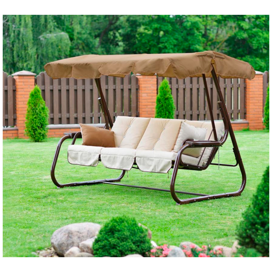 Внимание! Расцветка качелей на разных объектах может отличаться от изображённой на фото. Перед заказом уточняйте расцветку в наличии у оператора. Каркас: труба стальная Ø 51х1,4мм, полимерное покрытие, полка - 2 шт. Мягкий элемент: ткань 40% п/э – 60% хлопок, плотность 220-230г/м2, наполнитель мягкого элемента поролон + синтепон общей толщиной 80мм. Увеличенная высота спинки сиденья. Декор мягкого элемента тафтингом. Подушки – 2 шт. двухцветные.(наполнитель – синтепон). Тент: ткань с водоотталкивающей отделкой 100% п/э, плотность 125г/м2 или 90г/м2 с оконтовкой из отделочной тесьмой. Регулировка спинки: осуществляется звеньями цепи на требуемый угол наклона, с возможностью фиксации в разложенном положении.