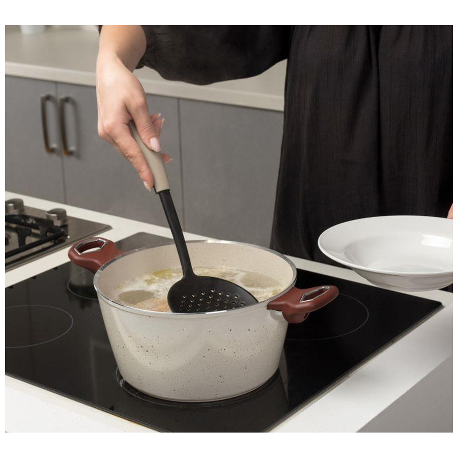 Идеально подходит для процеживания и подачи пельменей, вареников, лапши. Шумовка изготовлена из нейлона, который безопасен для использования в посуде с антипригарным, тефлоновым, гранитным и керамическим покрытием. Также безопасно использовать со стеклянной посудой. Эргономичная нескользящая ручка обеспечивает комфортную и безопасную работу. Устойчива к высоким температурам до 200°C. Подходит для мытья в посудомоечной машине. Оригинальный продукт греческого бренда NAVA из линейки кухонной утвари Misty. Размер 35x12 см.
