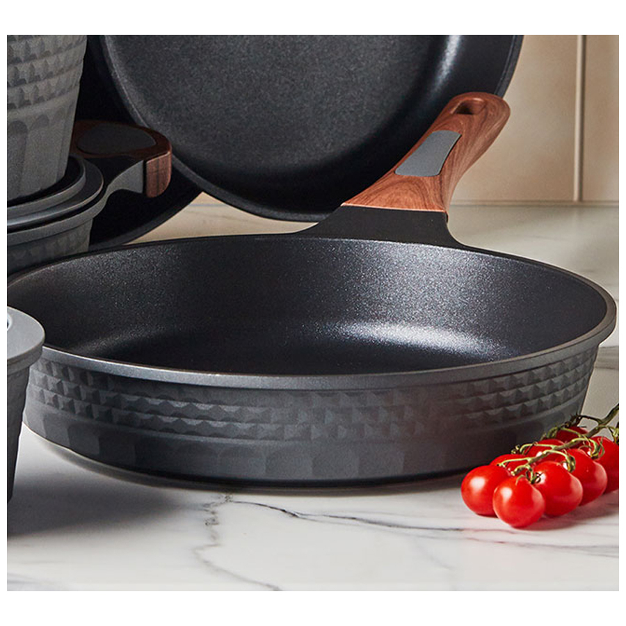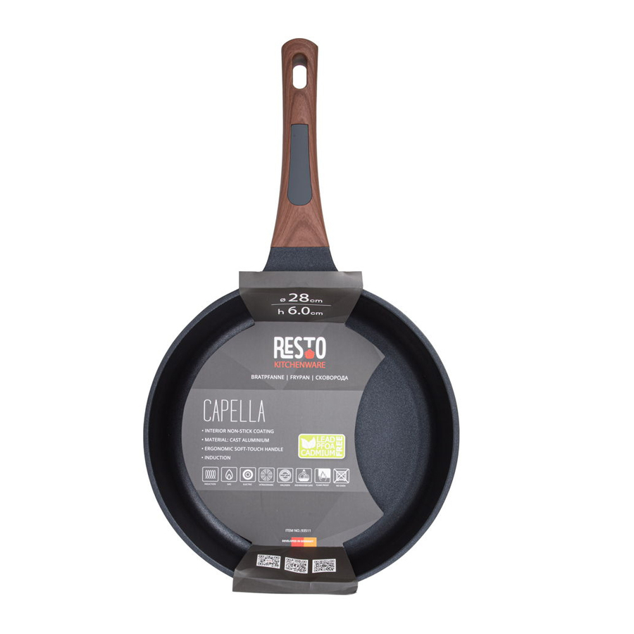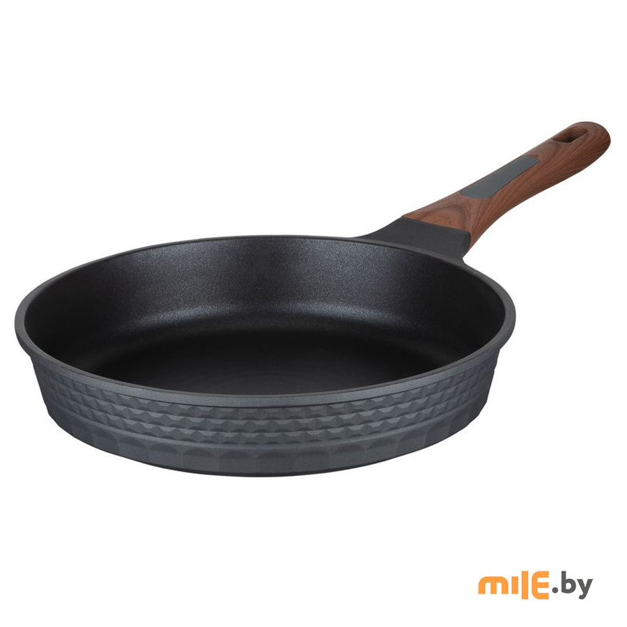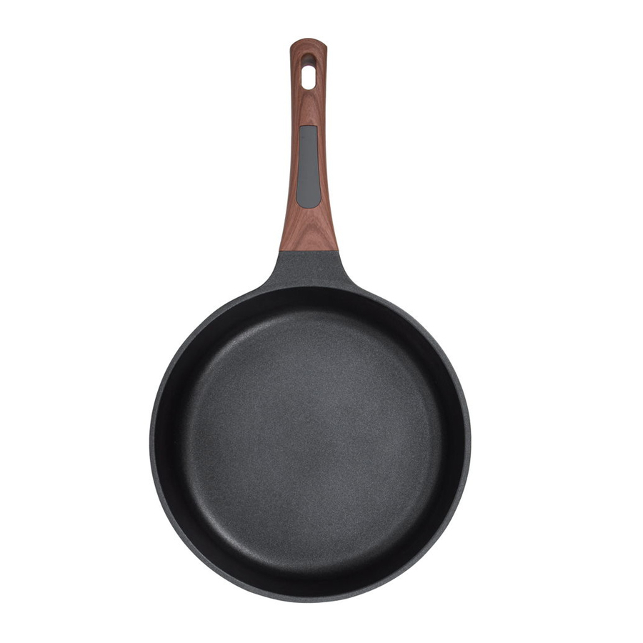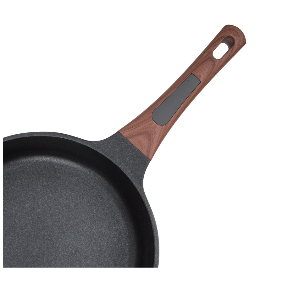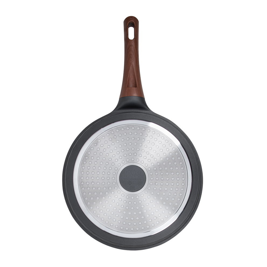 - Эргономичная прорезиненная ручка стилизованная под дерево с петлей для подвешивания сковороды.