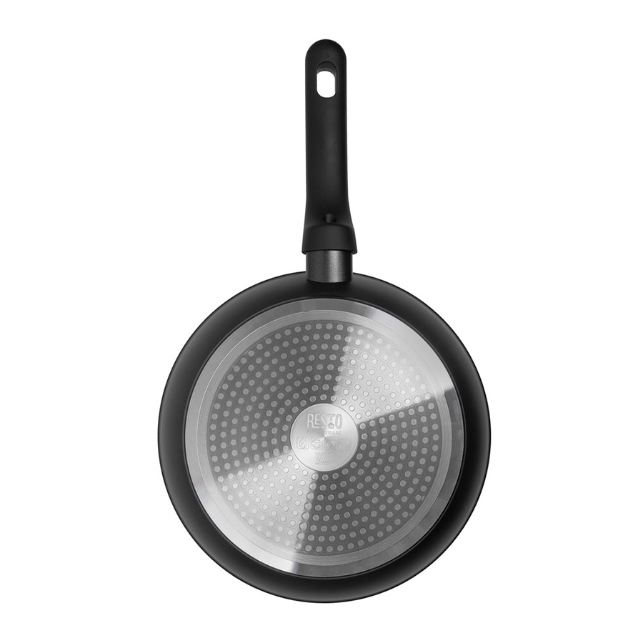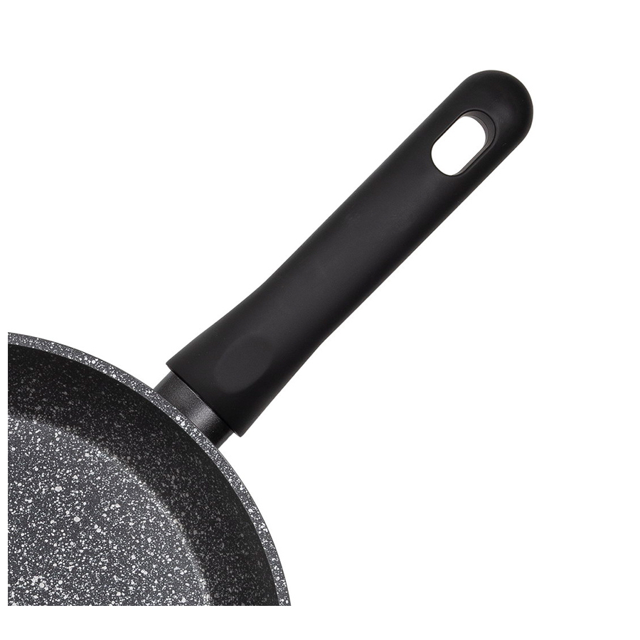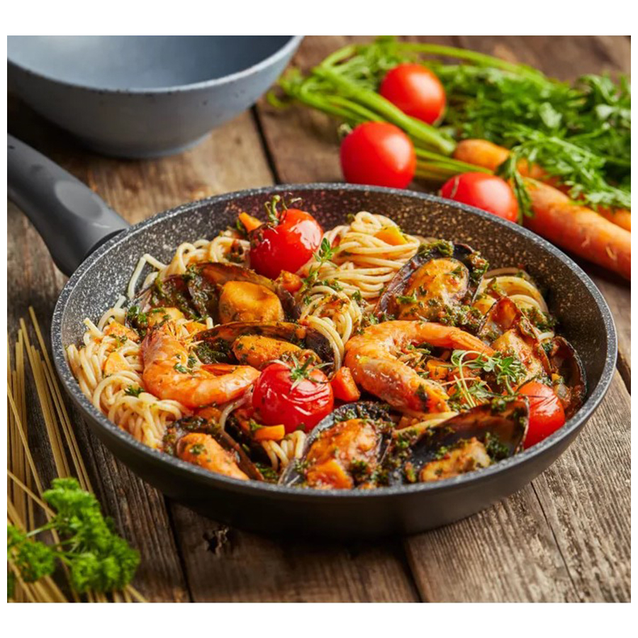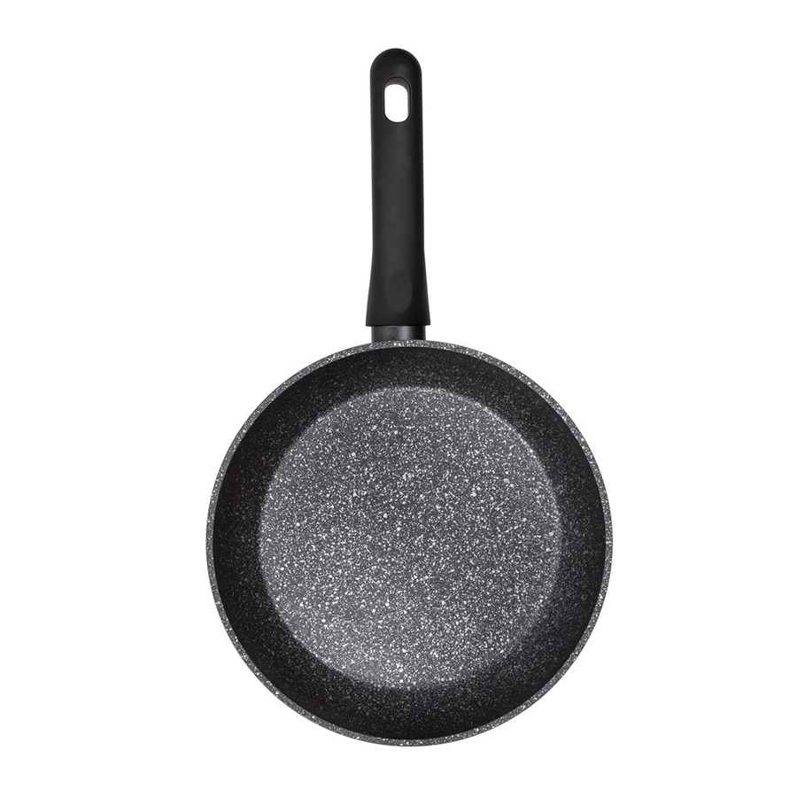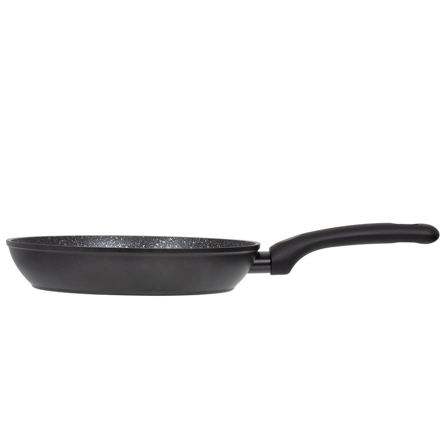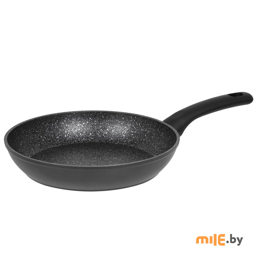 Внутреннее антипригарное мраморное покрытие. Эргономичная прорезиненная ручка. Петля для подвешивания сковороды. Дно сковороды дополнительно усилено антидеформационным диском. Индукция (подходит для всех типов плит).