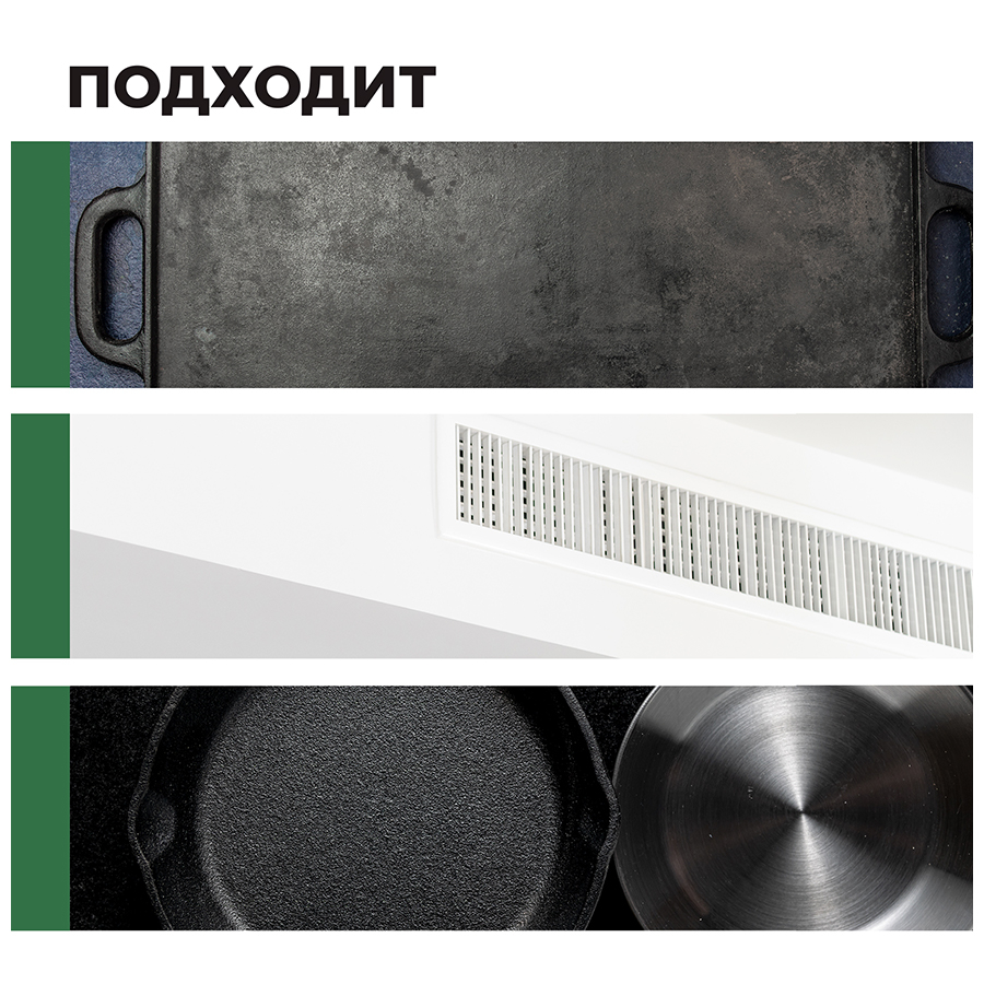 - Очищает от подгаров, копоти, масляных и жировых пятен.