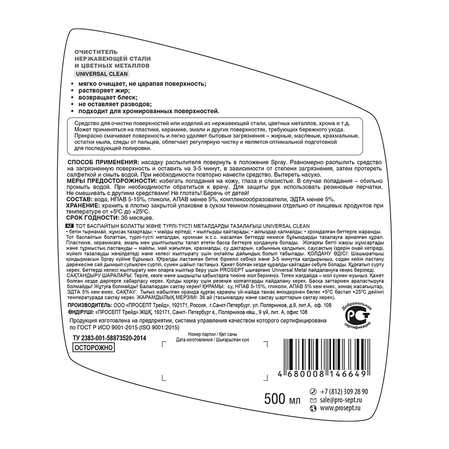 Очиститель для нержавеющей стали и цветных металлов Prosept Universal Clean Professional 500 мл