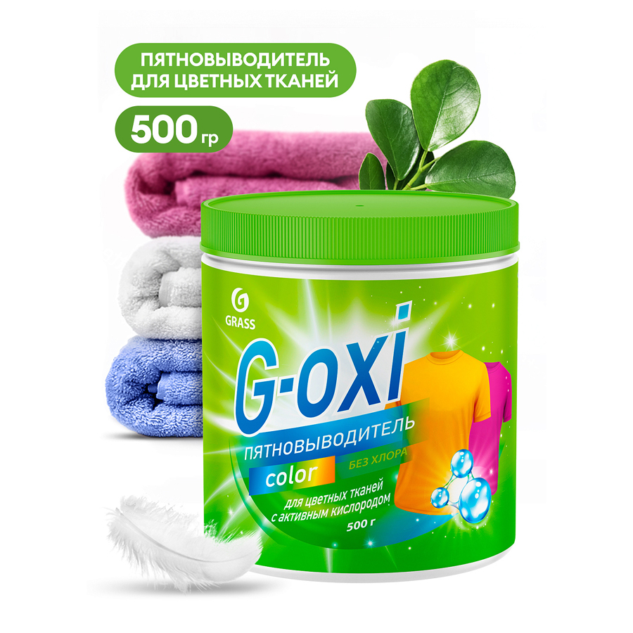 Пятновыводитель G-Oxi для цветных вещей с активным кислородом. Благодаря активному кислороду пятновыводитель для цветных вещей удаляет загрязнения различного происхождения, устранят запахи, легко справляется с пятнами от травы, ягод, красного вина, сока, шоколада и др. Подходит для белых и цветных вещей.