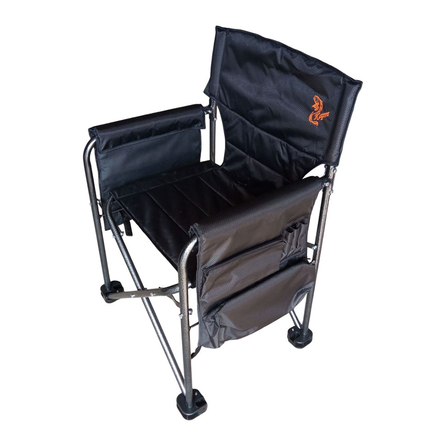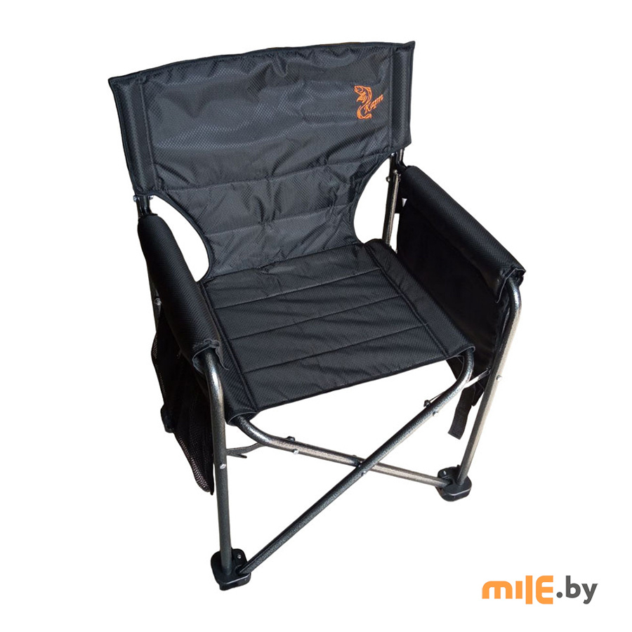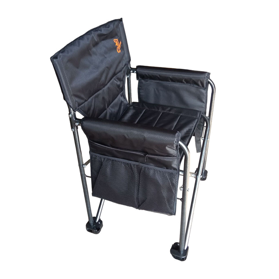 Каркас изготовлен из металлической трубы, покрыт молотковой краской (устойчива к царапинам и сколам), соединен болтами и денферными гайками. В основаниях кресла используется пятоки из прочная пластмассы (увеличивает устойчивость кресла на мягком грунте). Обивка и подлокотники изготовлены из ткани Оксфорд 600 ПВХ (не промокает, легко чистится от загрязнений), усилены тканью из пленочных нитей (не растягивается). В обивке и подлокотниках мягкое наполнение.