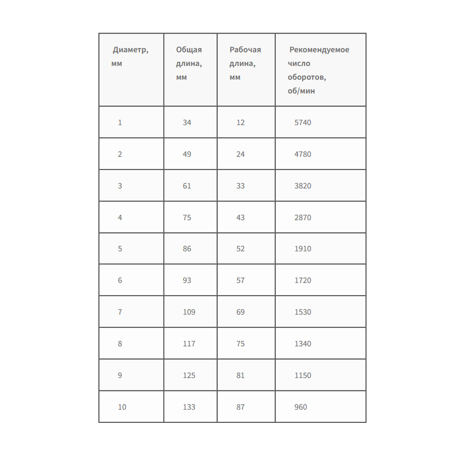 В состав набора входят сверла: 1 мм (12х34 мм), 2 мм (24х49 мм), 3 мм (33х61 мм), 4 мм (43х75 мм), 5 мм (52х86 мм), 6 мм (57х93 мм), 7 мм (69х109 мм), 8 мм (75х117 мм), 9 мм (81х125 мм), 10 мм (87х133 мм).