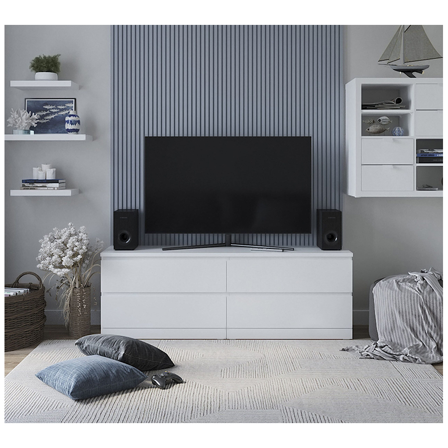 Стильный удобный комод с 4 выдвижными ящиками. Прекрасно дополнит интерьер и теплую уютную домашнюю атмосферу. Хорошие параметры функциональности (качественные телескопические направляющие, вместительность, удобство использования). Поверхность окрашена экологически безопасными материалами, продолжительное время сохраняет внешний вид. Может использоваться как для хранения вещей, так и в качестве ТВ-тумбы.