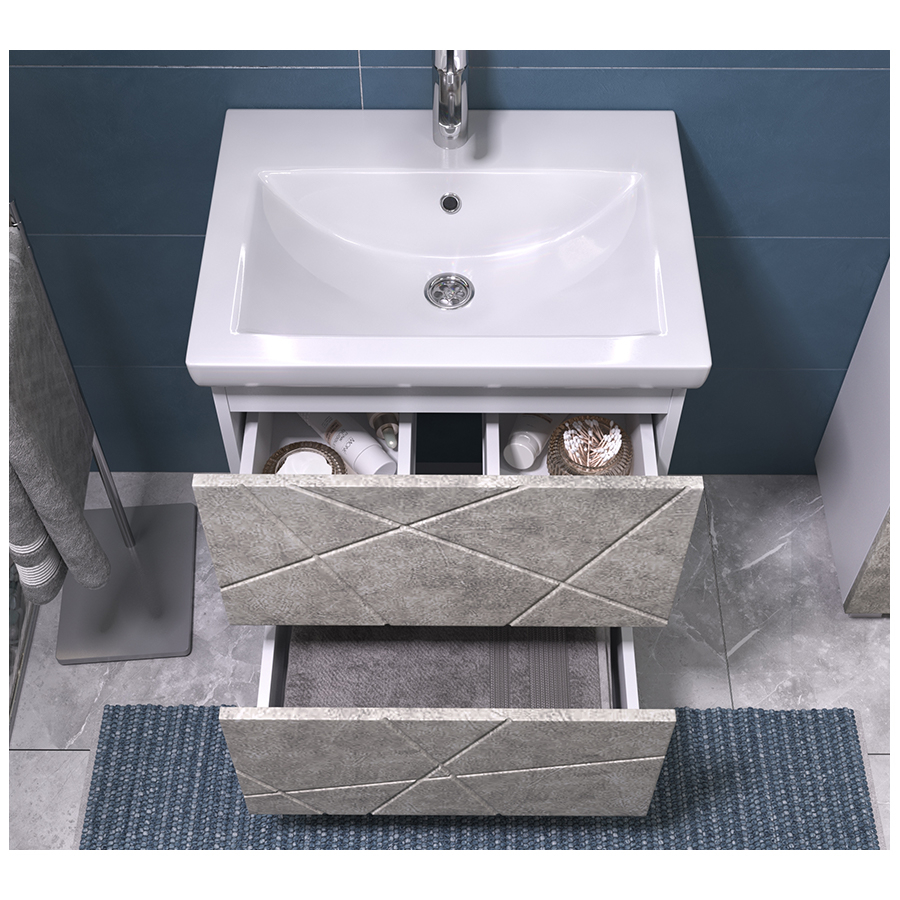 Тумба под раковину Geometry - это стильное и функциональное решение для ванной комнаты. Она поможет организовать пространство и создать уютную атмосферу. Тумба изготовлена из качественных материалов: корпус из ЛДСП, фасад из ЛМДФ. Корпус покрыт ламинатом, а фасад — глянцевой плёнкой ПВХ. Это обеспечивает долговечность и надёжность изделия. Система хранения представлена двумя выдвижными ящиками с направляющими скрытого монтажа. Ящики открываются нажатием — механизм push-to-open.