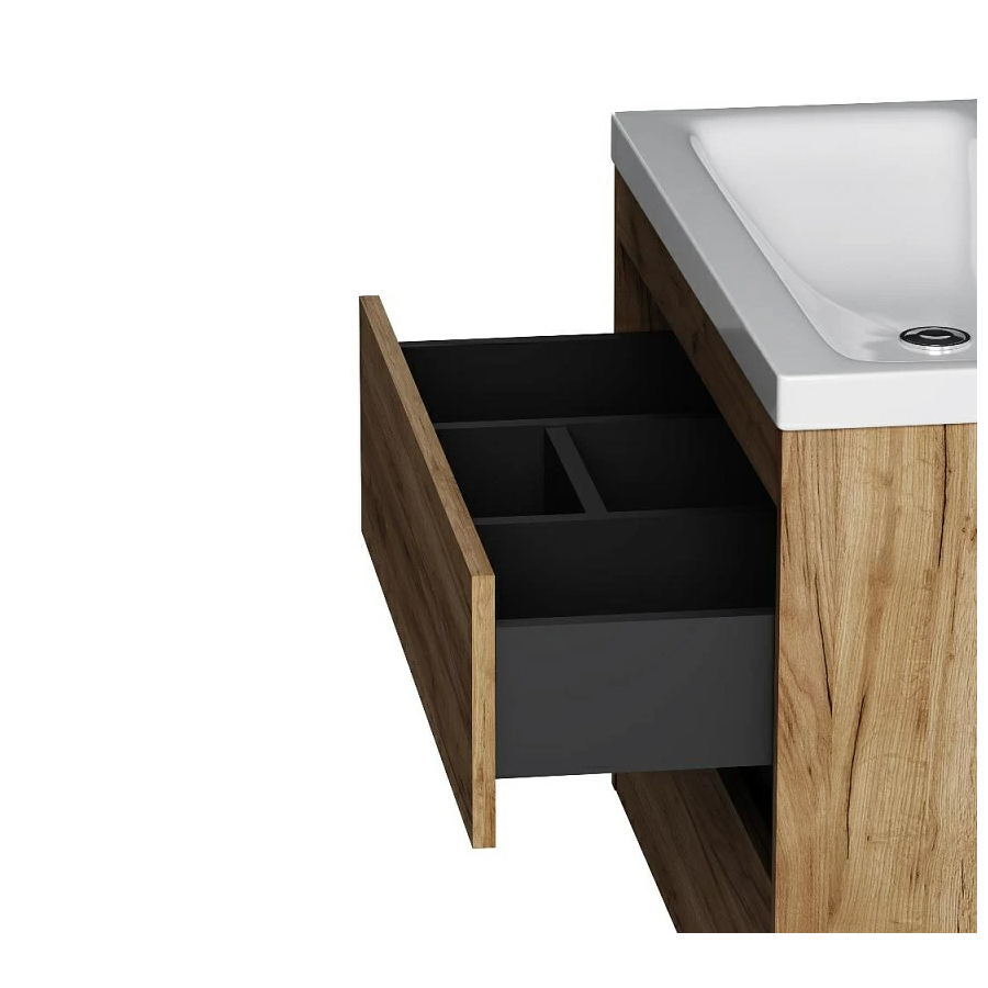Подвесная тумба бренда AM.PM коллекции Pulse создана в стиле минимализм. Фасады, выполненные в цвете "текстурированное дерево", дополнены вставкой в цвете "графит". Внутреннее покрытие каждого ящика выполнено в современном цвете "антрацит" и имеет противоскользящее покрытие. Мягкое открытие и закрытие ящиков обеспечивают направляющие скрытого монтажа с системой мягкого закрывания soft close. Фасад и корпус тумбы выполнены из влагостойкого ЛДСП. Покрытие корпуса и фасада - ламинат. Размер тумбы (Ш/Г/В): 760x420x580 мм. Цвет тумбы – "текстурированное дерево".