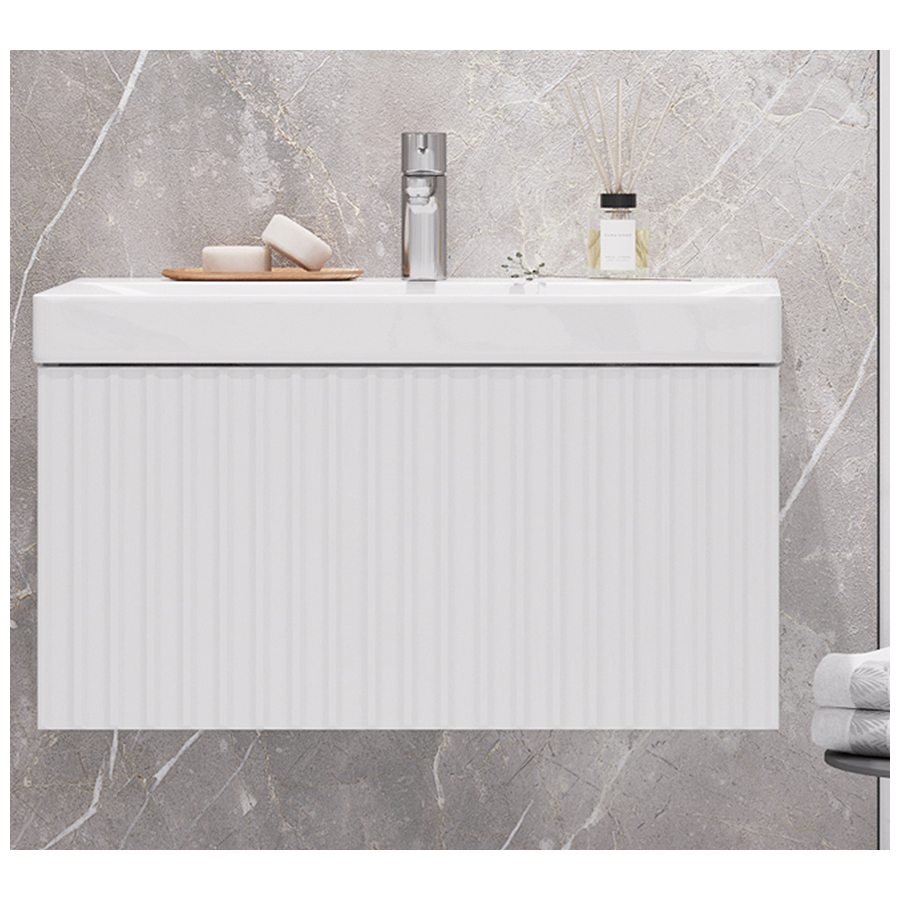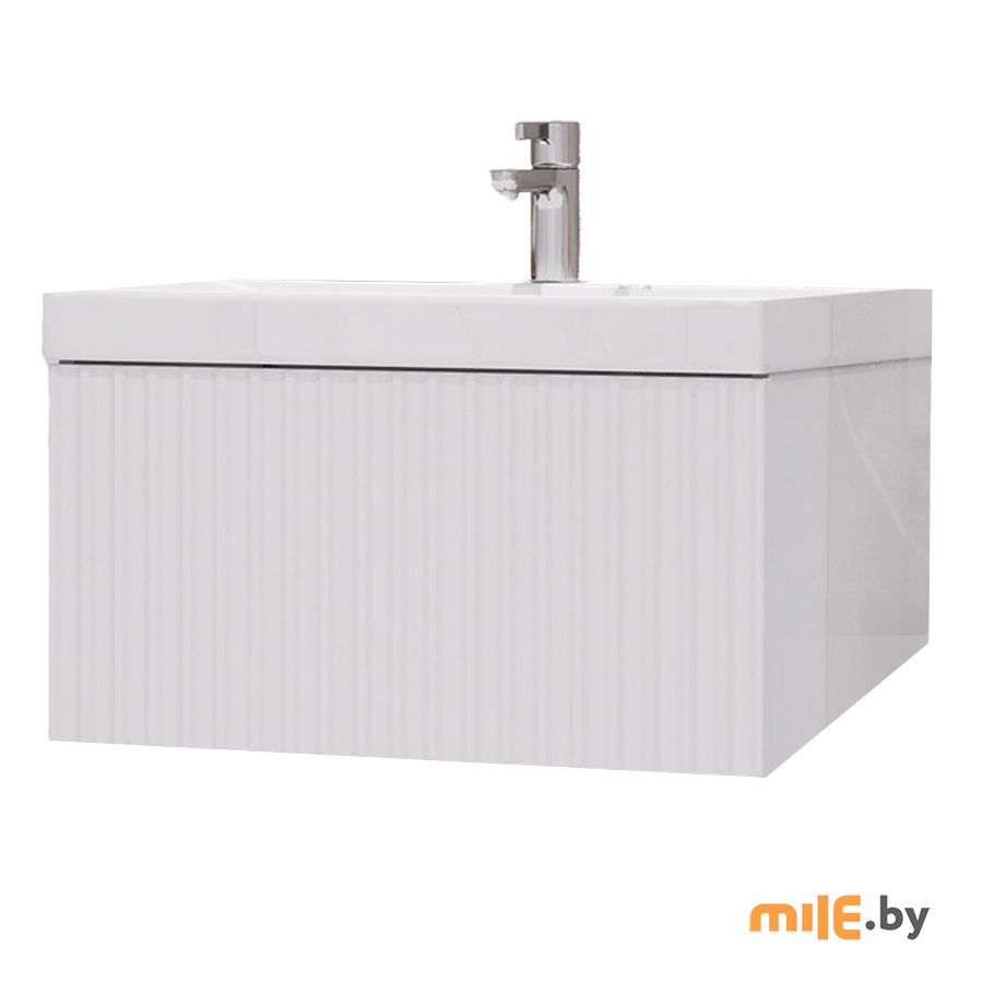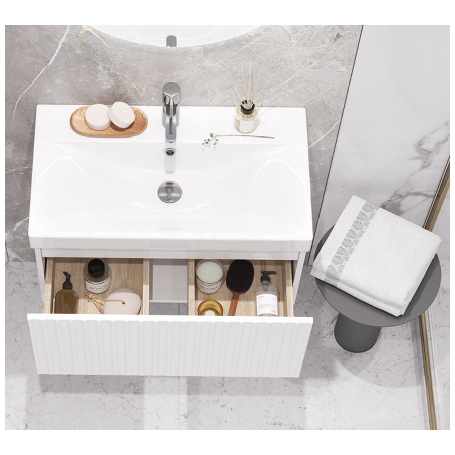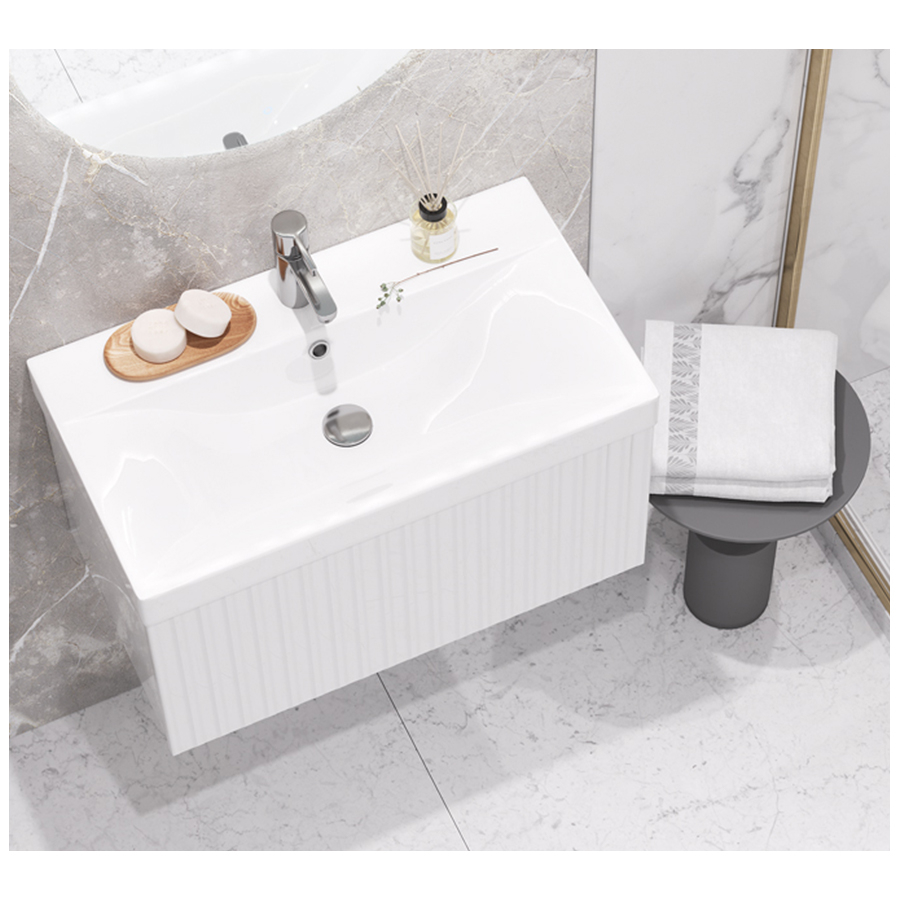 Тумба под умывальник Velvex Compo 700-0-1 - оригинальная подвесная модель с вертикальной фрезеровкой фасада. Утонченный дизайн подчеркивает отсутствие лицевой фурнитуры. Система хранения представляет собой вместительный выдвижной ящик с механизмом push-to-open, срабатывающим на нажатие. Фасад выполнен из влагостойкой МДФ. Пленочное покрытие ПВХ придает изделию дополнительную защиту от влаги и механических повреждений.