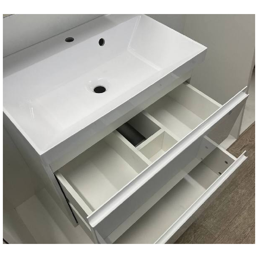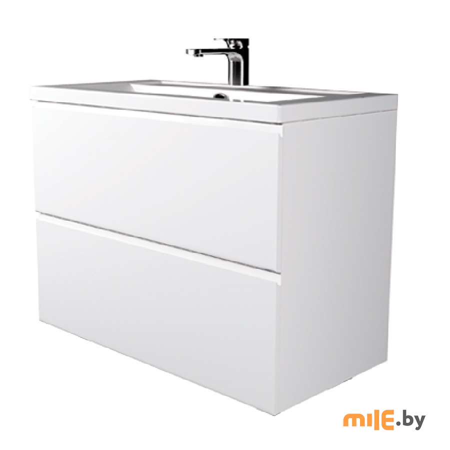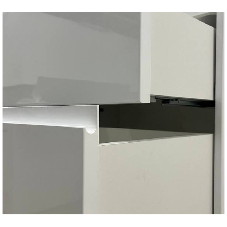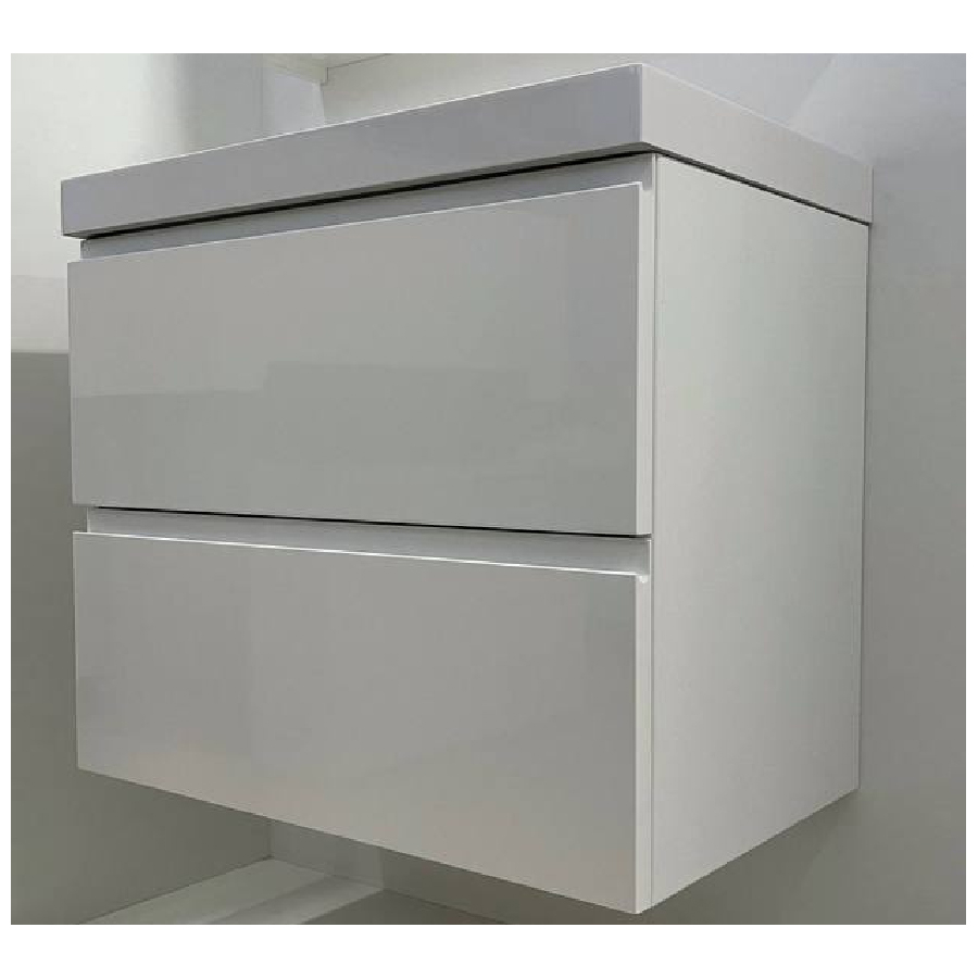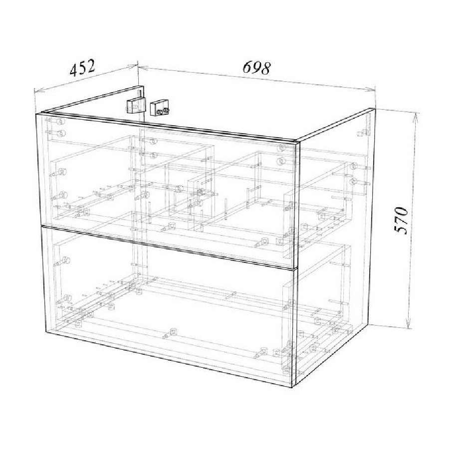 В собранном виде: фасады с интегрированной ручкой, два выдвижных ящика (направляющие с доводчиками), в верхнем ящике предусмотрен вырез под сифон.