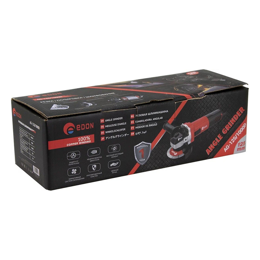 Угловая шлифовальная машина (УШМ болгарка) Edon AG-125/1000D - электроинструмент, предназначенный для резки, шлифовки различных типов материалов и поверхностей. Особенности конструкции шлифовальной машинки. Корпус редуктора УШМ состоит из литого алюминия, игольчатый опорный подшипник электроинструмента позволяет работать с высокими нагрузками , шестерни редуктора из инструментальной стали. Болгарка оснащена пылезащитным кожухом, подшипниками закрытого типа и двойной изоляцией обмотки двигателя. У угловой шлифовальной машины имеется защита от перегрузок и эффективной системой охлаждения, что обеспечивает Вашу работу более надежной и долговременной. 100% медная обмотка двигателя, высокий крутящий момент в 11000об/мин . Удобная ручка садового инструмента позволяет удобно и безопасно управлять ею во время работы. Строительный инструмент благодаря своими особенностями станет незаменимым в любом мастерском деле. Доп. опции шлифмашины: защита от перегрузок, блокировка шпинделя.