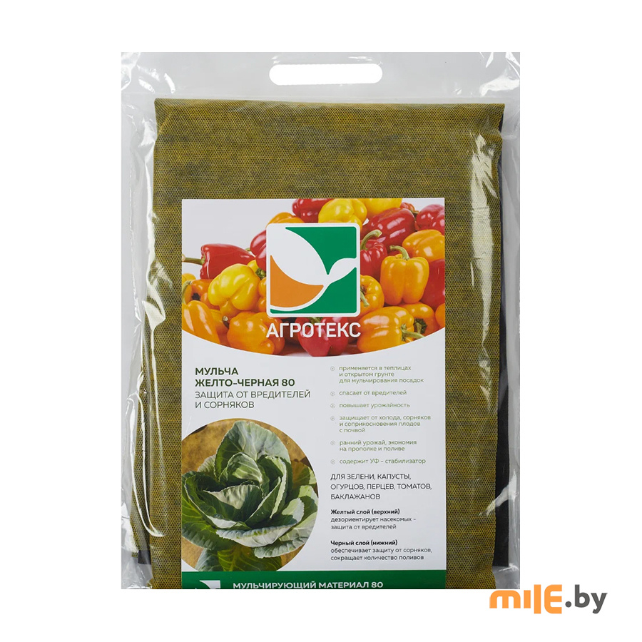 Мульчирующий укрывной материал жёлто-чёрный Агротекс предназначен для выращивания капусты, томатов, перцев, баклажанов и зелени. Желтый внешний слой дезориентирует насекомых, черный внутренний слой защищает от роста сорняков, растение требует меньше поливов. УФ стабилизатор делает материал устойчивым к солнечному свету.