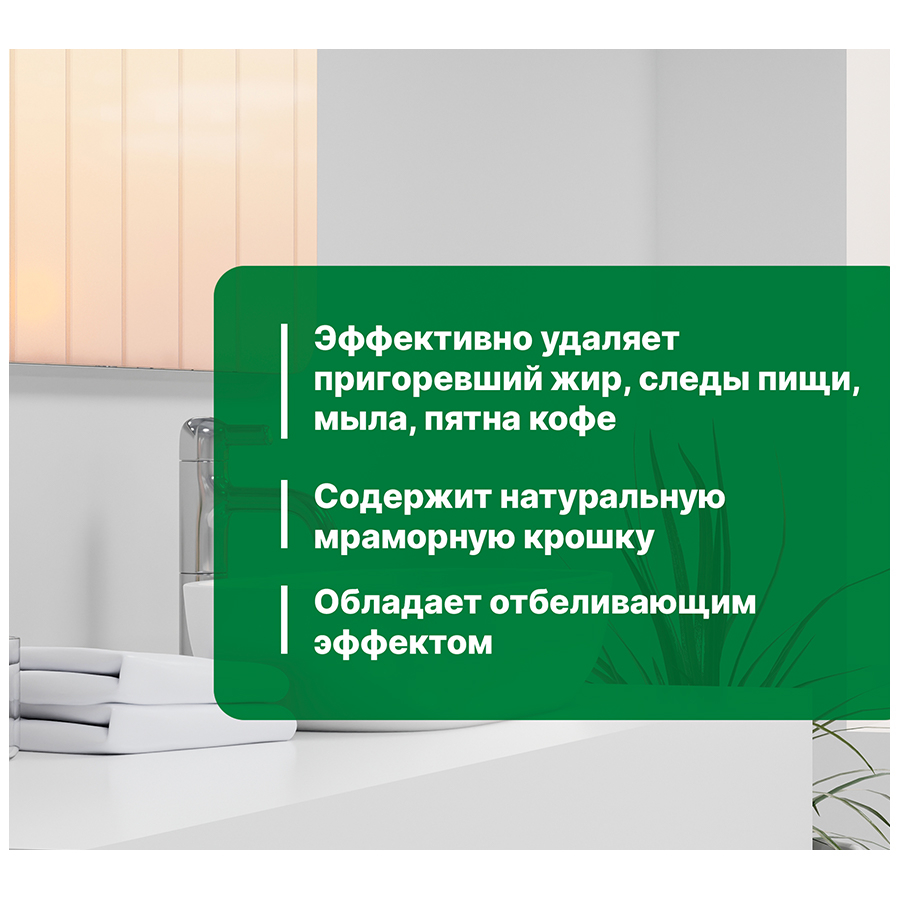 Состав: природный молотый мрамор, сода, сульфат натрия, хлорсодержащий компонент, АПАВ менее 5%, парфюмерная композиция.