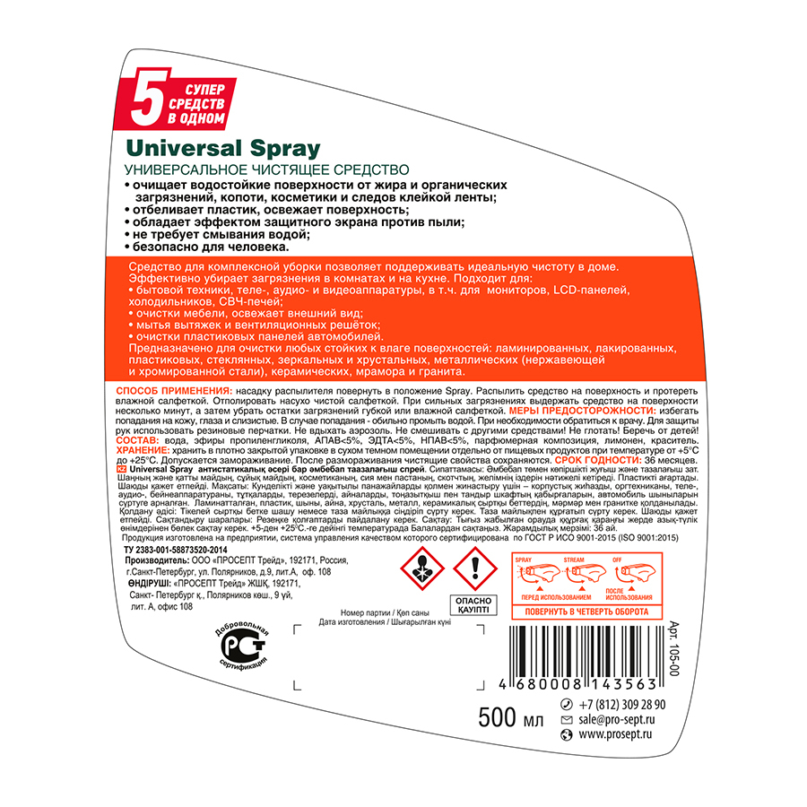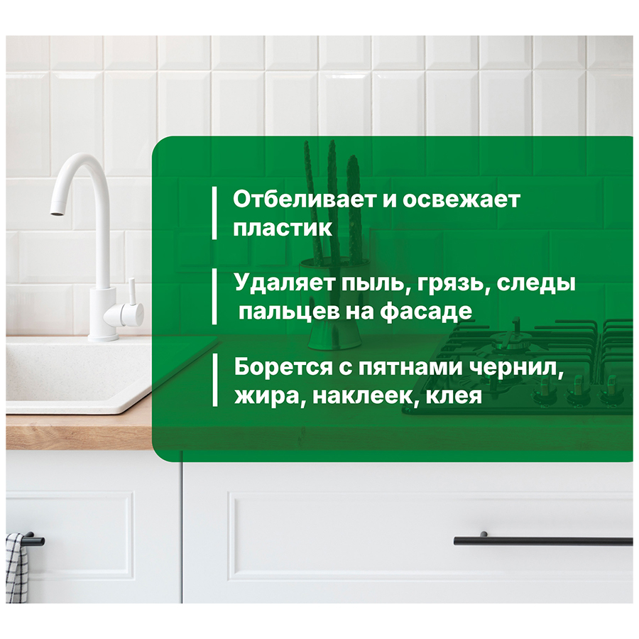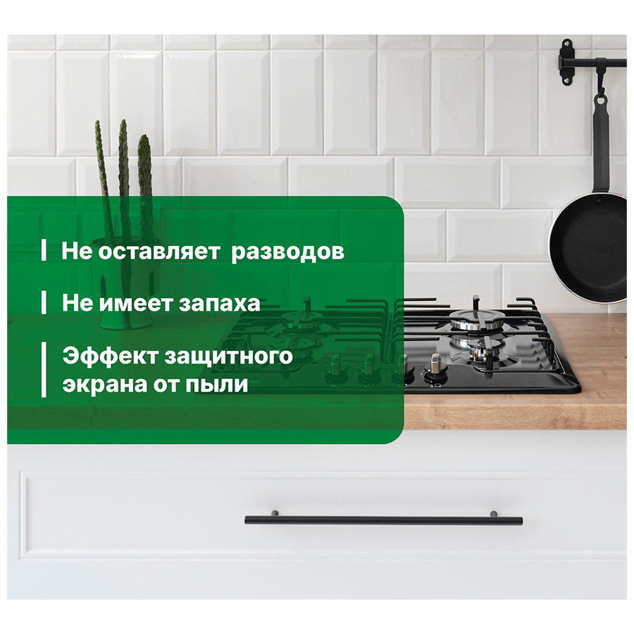 Область применения: для ежедневной и периодической уборки помещений: протирки фасадов кухонной мебели, столешниц, стеновых панелей, дверей и косяков, оргтехники, теле-, аудио-, видеоаппаратуры, поручней, подоконников, окон, зеркал, стенок холодильника и духовых шкафов, автомобильных стекол.