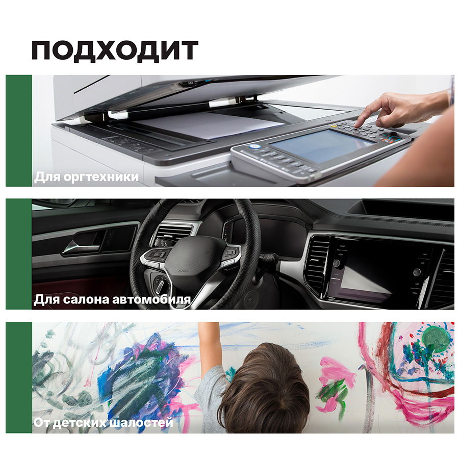 - Очищает любые поверхности от органических загрязнений, следов жира, масла, косметики, чернил и пасты, клейкой ленты и клея.