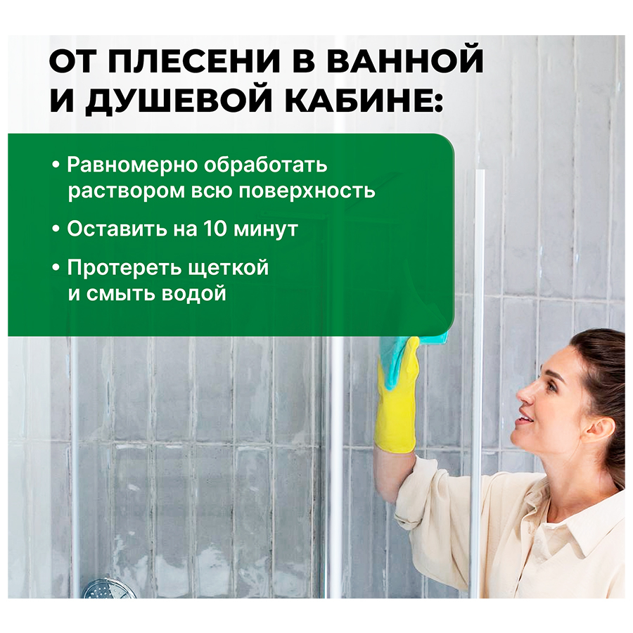 3. Чистка кафеля, душевых кабин: нанести на поверхность, дать подействовать несколько часов. Промыть водой.