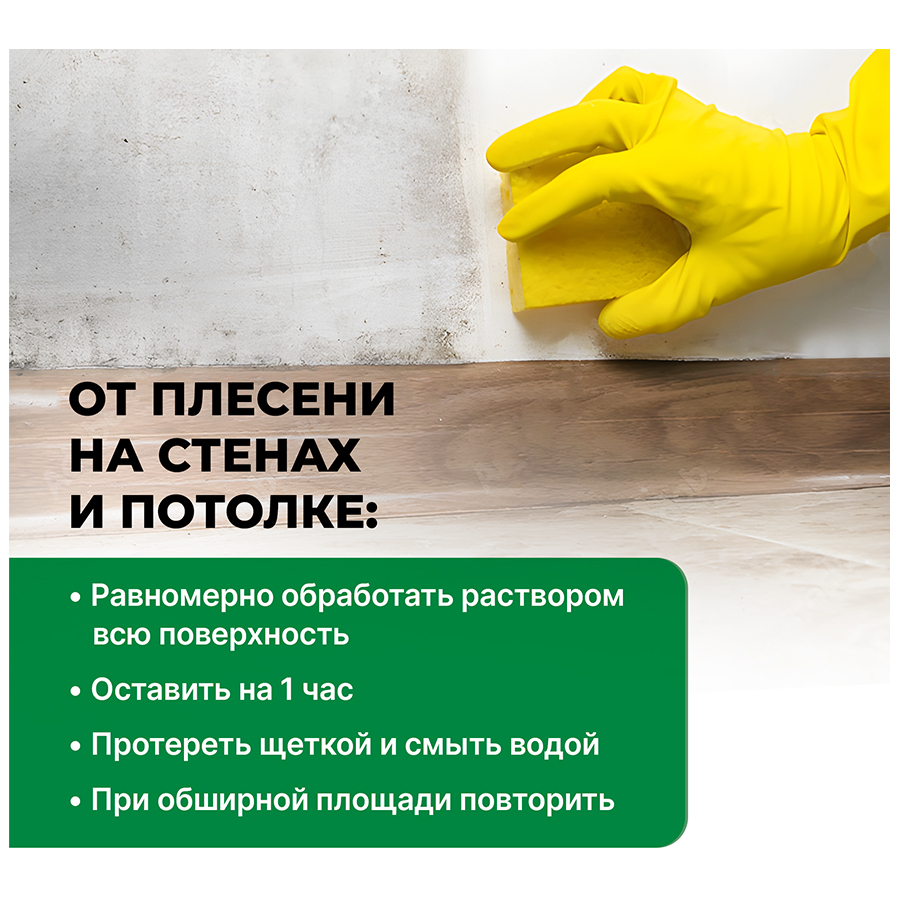 Меры предосторожности: При работе с удалителем плесени использовать индивидуальные средства защиты: очки, перчатки. При попадании раствора на кожу или в глаза промыть большим количеством воды, при необходимости обратиться к врачу. В закрытых помещениях рекомендуется обеспечить вентиляцию и, по возможности, максимально сократить время пребывания в помещении. Беречь от детей!