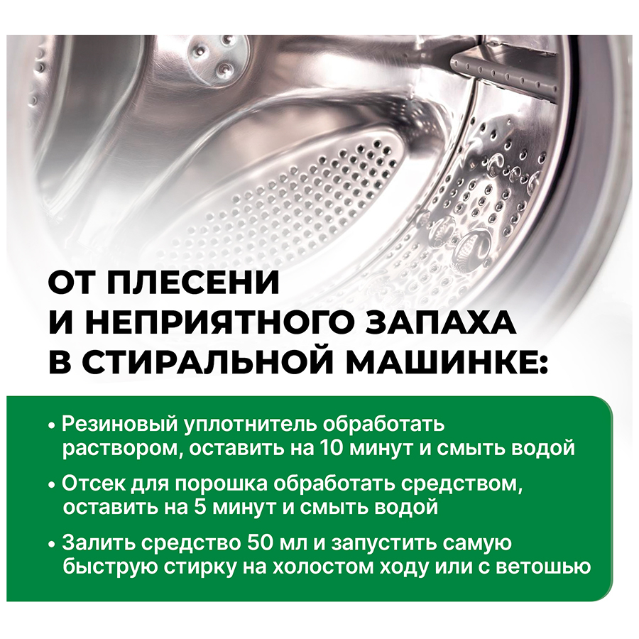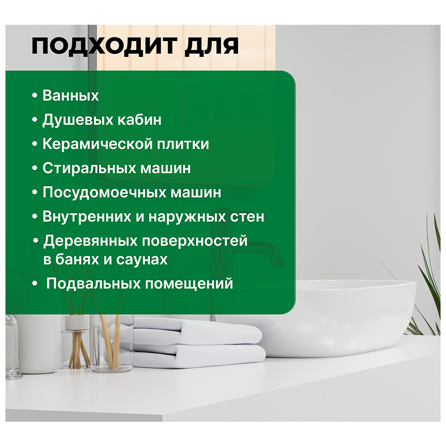 Обладает дезинфицирующим эффектом, блокирует развитие плесени и микроорганизмов, удаляет запахи. Применяется для очистки внутренних и наружных стен зданий, ванных комнат, душевых кабин, эффективно очищает деревянные поверхности в банях и саунах, удаляет плесень и запахи в подвальных помещениях.