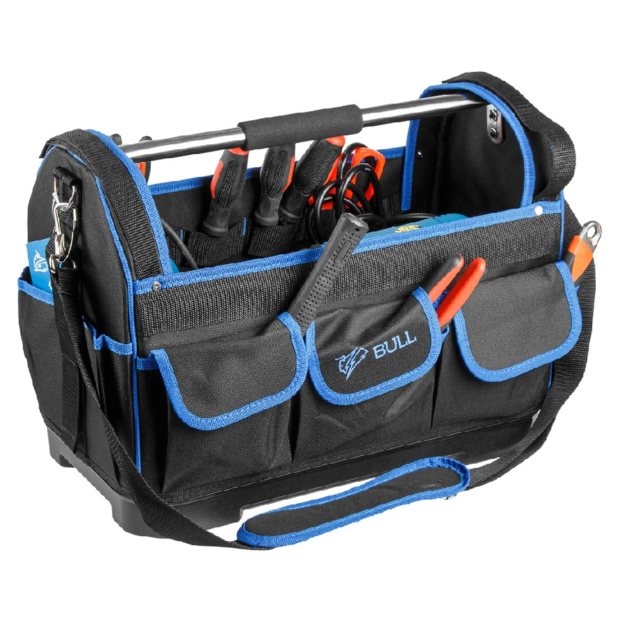 Сумка для инструмента Bull WB 4035 предназначена для переноски, хранения и удобного использования различных инструментов. Изготовлена из прочной нейлоновой ткани. Металлическая ручка с мягкой насадкой предназначена для комфортной переноски инструмента. Регулируемый ремень для переноски на плече. Пластиковое дно способствует повышенной безопасности инструмента в случае падения сумки, а также защитит инструмент внутри от намокания, если сумка стоит мокрой поверхности. Имеет 11 внешних карманов для хранения и 20 внутренних отсеков для переноса мелкой оснастки.