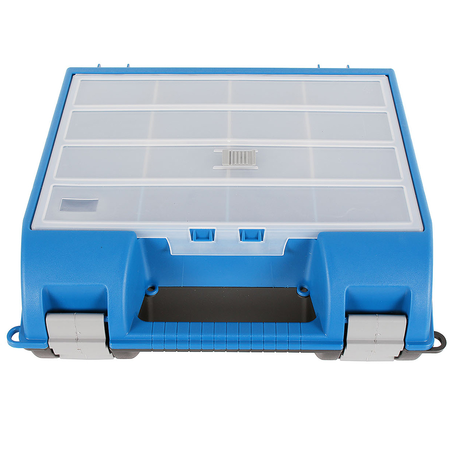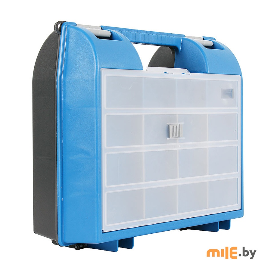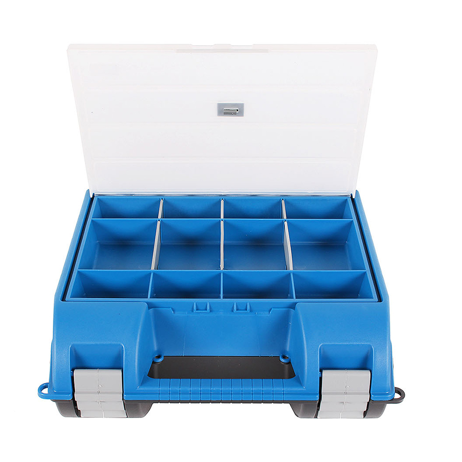 Ящик предназначен для хранения электроинструмента. Изготовлен из прочного пластика, устойчив к механическим повреждениям, морозу и влаге. Для мелких деталей на корпусе крышки предусмотрены специальные отсеки. Защелки эффективно фиксируют ящик и предотвращают выпадение предметов.