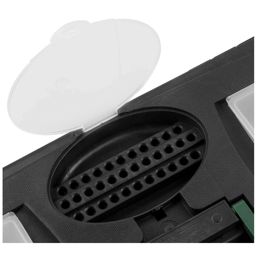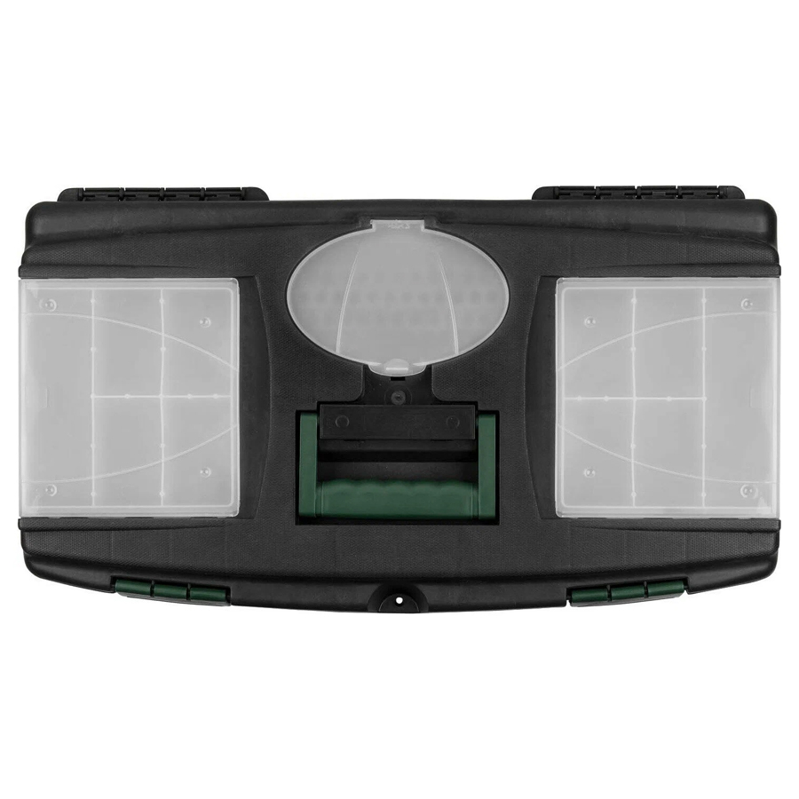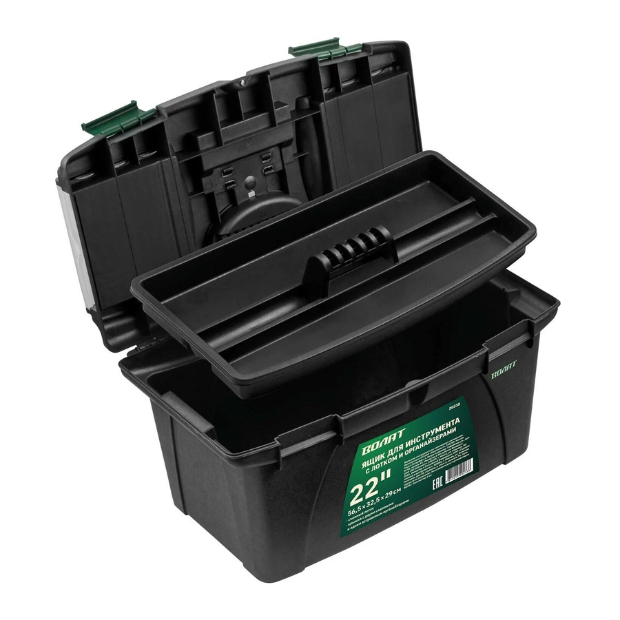 Ящик предназначен для хранения и удобной транспортировки инструментов. Подвижный лоток и два съемных органайзера на крышке позволяют разместить необходимые инструменты и аксессуары. Ящик надежно закрывается с помощью защелок.