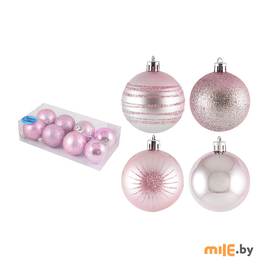 Набор из 8 ёлочных шаров из пластика. Диаметр шаров 6 см. В наборе 2 шара с глянцевым покрытием, 4 матовых шара с рисунком, 2 шара с посыпкой.