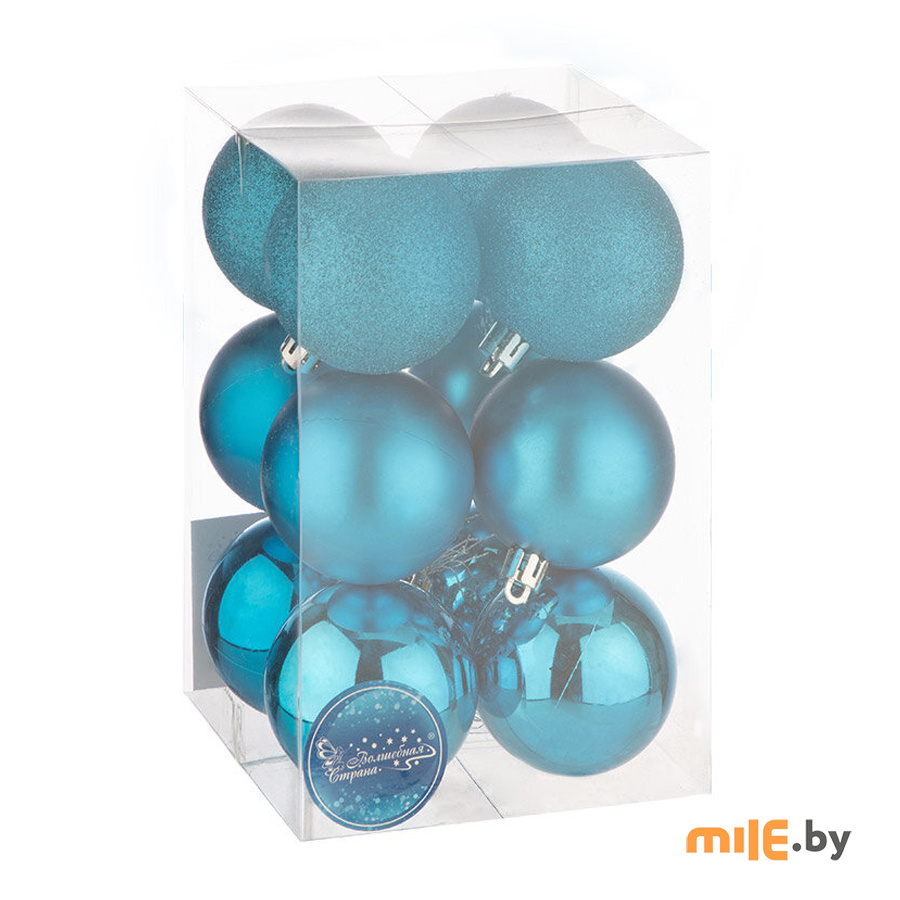 Набор из 12 ёлочных шаров из пластика. Диаметр шаров 6 см. В наборе 4 блестящих шара, 4 матовых шара, 4 шара с посыпкой.