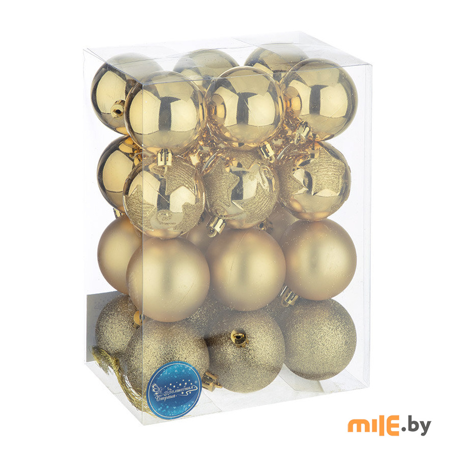 Набор ёлочных шаров из пластика 24 шт. Диаметр шаров 6 см. В наборе 9 блестящих шаров, 3 шт. блестящие с рисунком, 6 шт. матовые, 6 шт. с блестками.