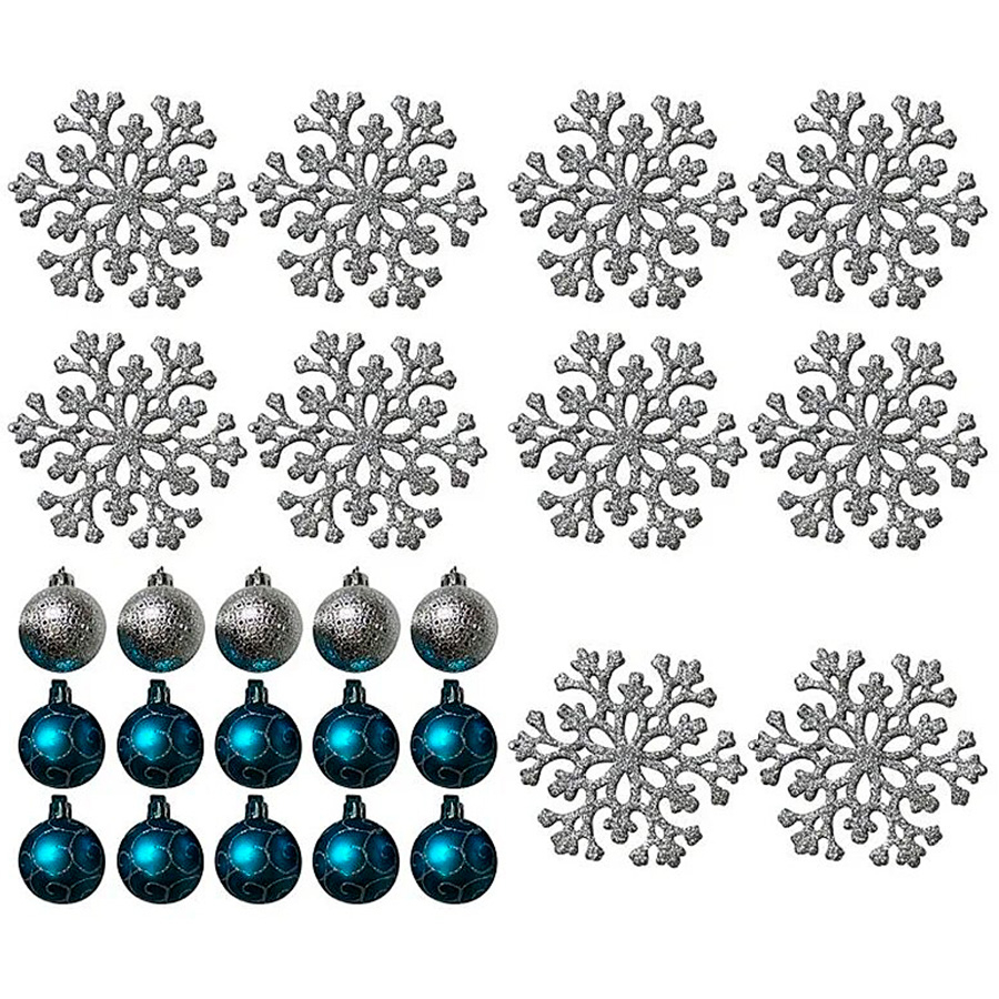 В набор входит 15 шаров по 4 см, 10 снежинок по 11 см.