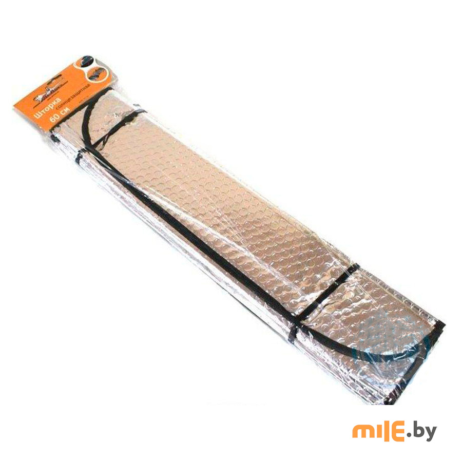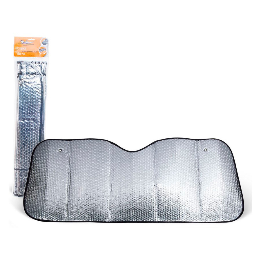Двусторонняя солнцезащитная шторка размером необходима для блокировки попадания солнечных лучей со стороны лобового стекла в салон машины. Серебристая поверхность шторки отражает солнечные лучи, защищая салон и торпеду автомобиля от нагрева. Крепится к лобовому стеклу с помощью двух присосок. Высота шторки 60 см - идеальна для отечественной классики и автомобилей A и B категории.