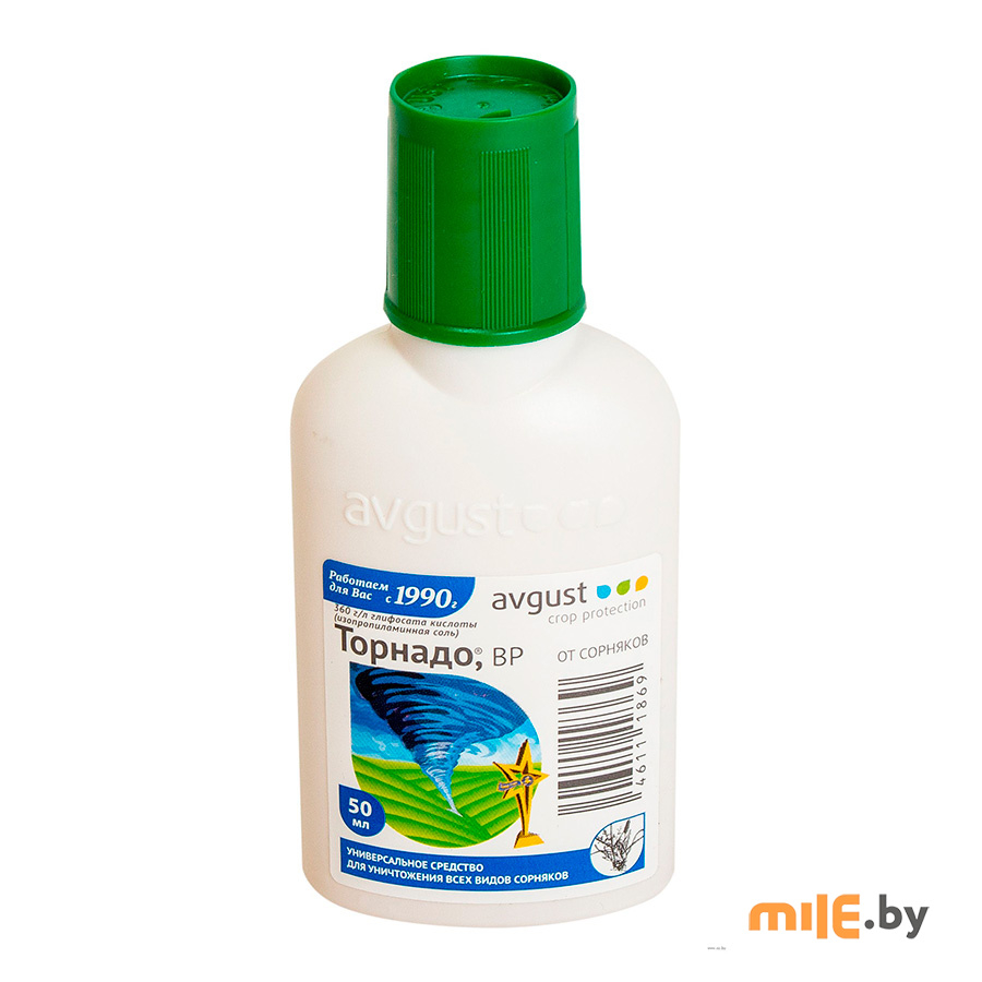 Высокоэффективный гербицид сплошного действия, обладает высокой всасываемостью и скоростью воздействия. Один из наиболее распространенных и широко применяемых гербицидов. Препарат Торнадо применяется как системный гербицид сплошного действия, применяется в садах и виноградниках, на приусадебных участках для борьбы с однолетними и многолетними сорными растениями. Он проникает в растение через листья и стебли, переходит в корневую систему и уничтожает растение целиком. Рекомендован для борьбы с такими сорняками, как пырей ползучий, свинорой, рогоз, вьюнок, тростник, бодяк.