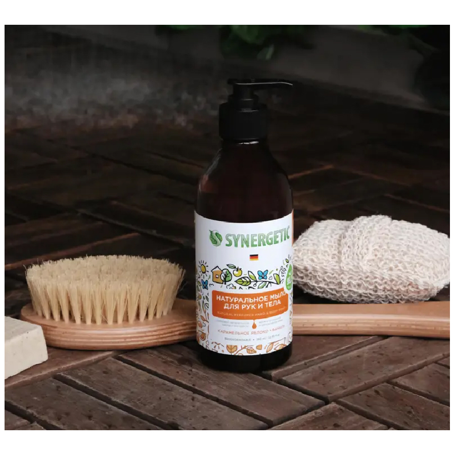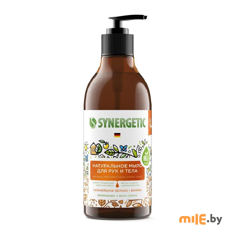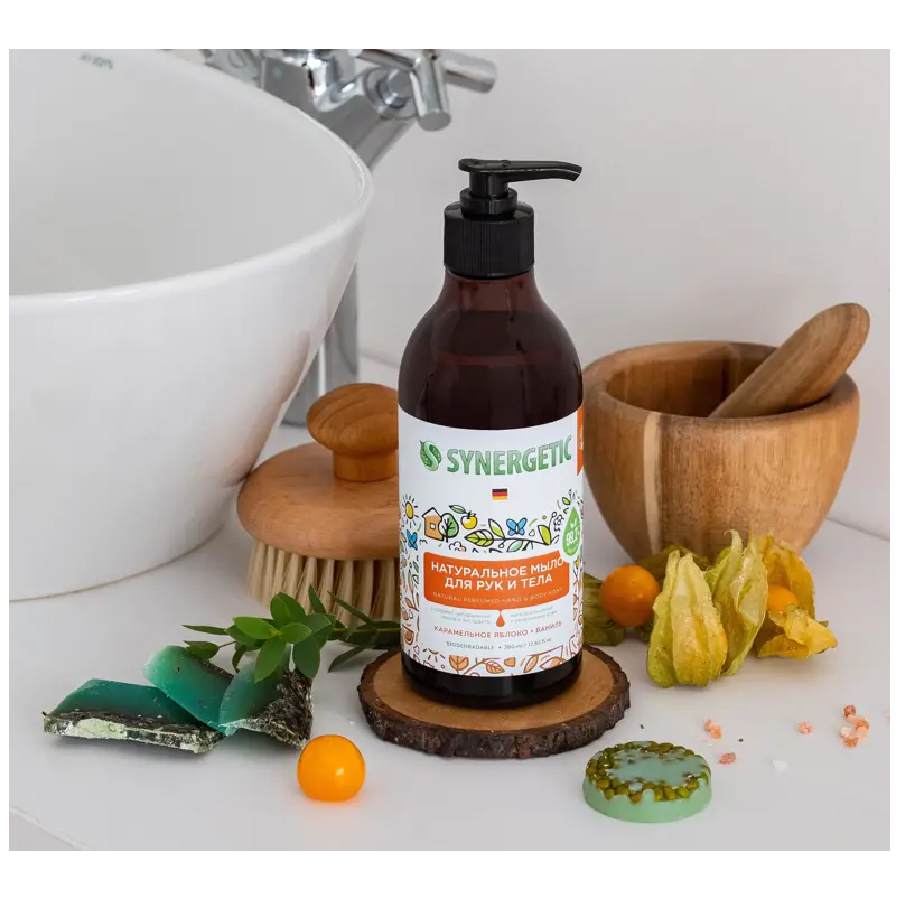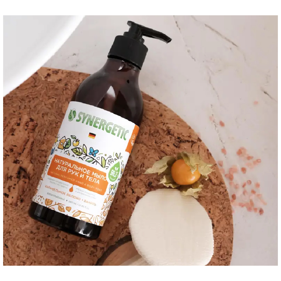 Аппетитный и легкий аромат натурального мыла Synergetic Карамельное яблоко и ваниль — это композиция натуральных эфирных масел померанца, корицы и лимона. Synergetic становится ближе к телу с новой парфюмированной линейкой мыла и гелей для душа. Выбирайте ароматы по настроению, вдохновляйте себя на приятные мысли и переключайтесь на комфорт и расслабление.